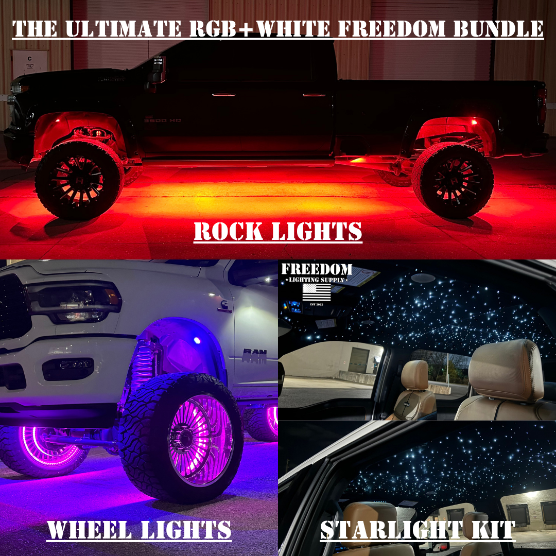 Ready to completely transform your ride with vibrant, color-shifting style and ultra-bright pure white performance? The Ultimate RGB+White Freedom Bundle is your all-in-one package—designed to give your vehicle a bold, customizable glow from the inside out while saving you money.